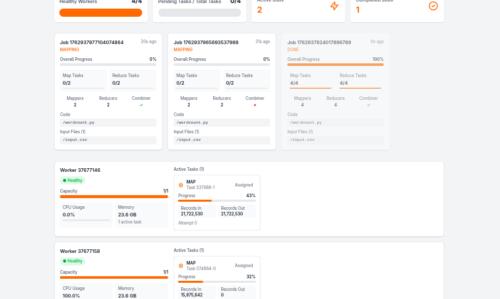Reimplementation of MapReduce based on the google research paper. Distributed system with a Boss (Go), and worker nodes (Python). Features a web dashboard for submitting jobs and viewing utilization/progress. Demos include counting large (10GB) csv files and a 2-job "chained" ridge regression.